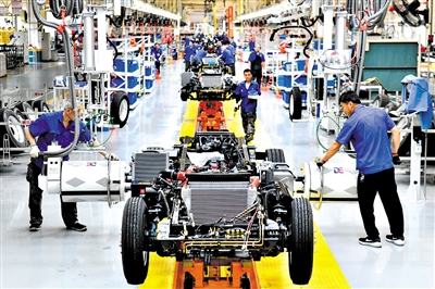 在位于威海市文登区的潍柴新能源商用车有限公司,工人在生产线上装配汽车。记者 郭绪雷 摄
