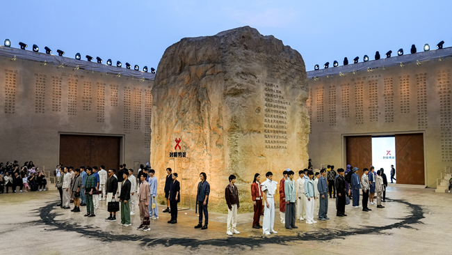 9月9日,河南郑州,“只有河南·戏剧幻城”,一场“茄克·龙的传人”时尚大秀在这里上演。现代舞《溯·问》开场,8名舞者以遒劲虔诚之姿掬一抔粝土,缓缓置于浑厚的黄土地之上;由215立方米的黄土夯垒起的“河南土”矗立幻城夯土秀场中央,四面夯土墙上展现中原大地18个地市、100多个县,以及1700多个乡镇的名字;国家级非物质文化遗产项目(渠县刘氏竹编)代表性传承人刘嘉峰亲手编制的经纬纹理竹编融合设计在了出场的劲霸男装的茄克上……数千年中原历史文化的厚重与当代茄克时装的时尚不断交织碰撞,让大秀现场亮点频出。