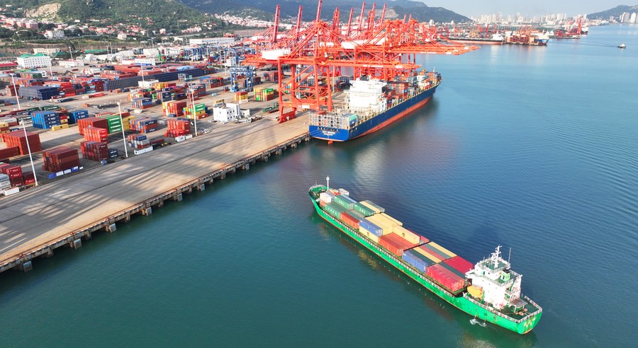8月8日,在江苏连云港港,进港货轮缓缓停靠码头(无人机照片)。新华社发(耿玉和 摄)