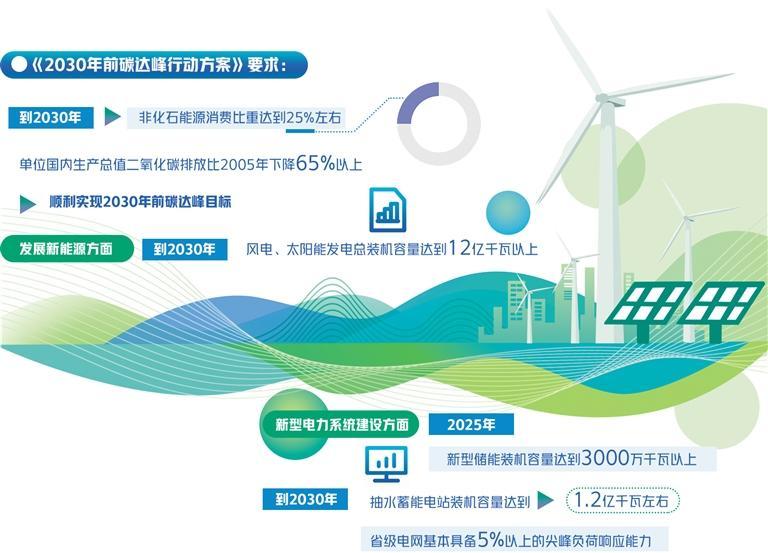 2021年国务院印发的《2030年前碳达峰行动方案》提出了非化石能源消费比重、能源利用效率提升,二氧化碳排放强度降低等主要目标。《方案》要求将碳达峰贯穿于经济社会发展全过程和各方面,重点实施能源绿色低碳转型行动、节能降碳增效行动、循环经济助力降碳行动、绿色低碳科技创新行动等“碳达峰十大行动”,并就开展国际合作和加强政策保障作出相应部署。