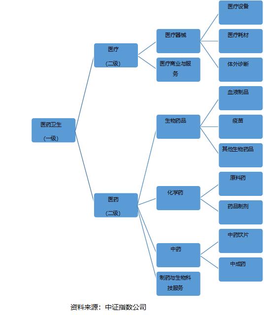 首先,我们需要帮助大家梳理医药和医疗,这两个名称只有一字之差的行业里,各自包含了些什么?我们以中证行业分类来讲解,在一级行业医药卫生下包含了包括了医疗、医药两个二级行业,其后还有进一步细分的三级、四级行业,如下图所示: