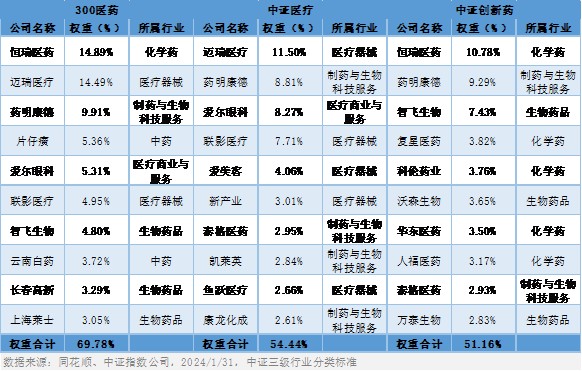 表2:300医药、中证医疗、中证创新药指数前十大成份股