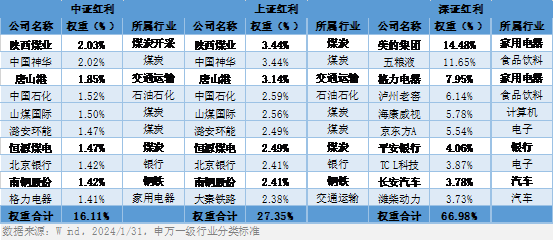 【要点:中证红利与上证红利前十大成份股基本重合,权重股集中度中证红利<上证红利<深证红利】