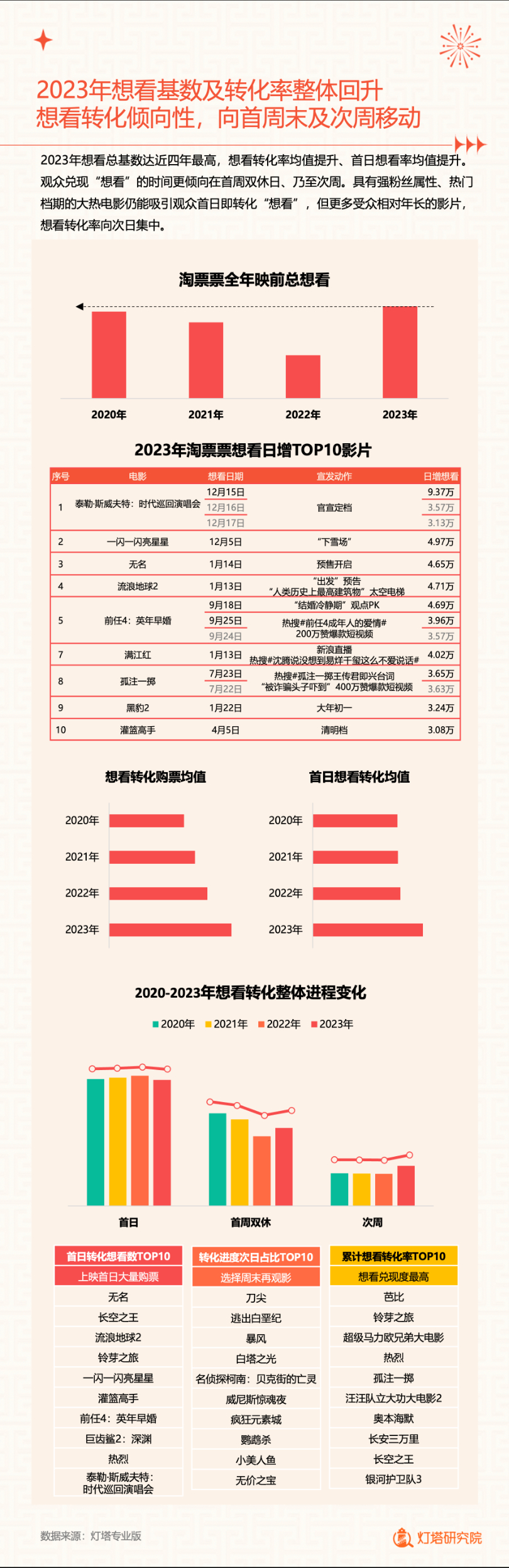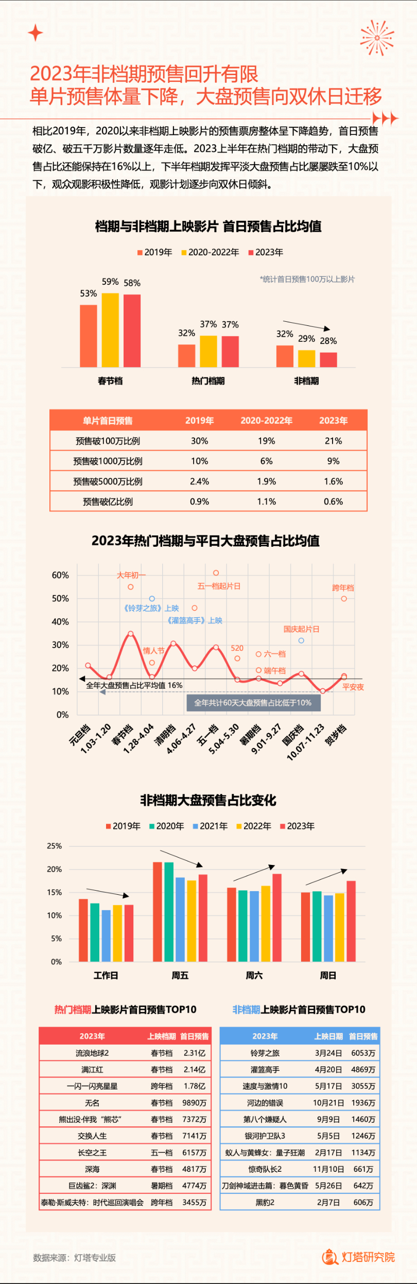 新华网北京1月2日电(记者闫雨昕)2024年1月1日,灯塔研究院联合新华网发布《2023中国电影市场年度盘点报告》(以下简称“报告”),从市场核心数据、观影消费习惯、热门档期与周末档、宣发新风向、用户画像等方面进行分析。