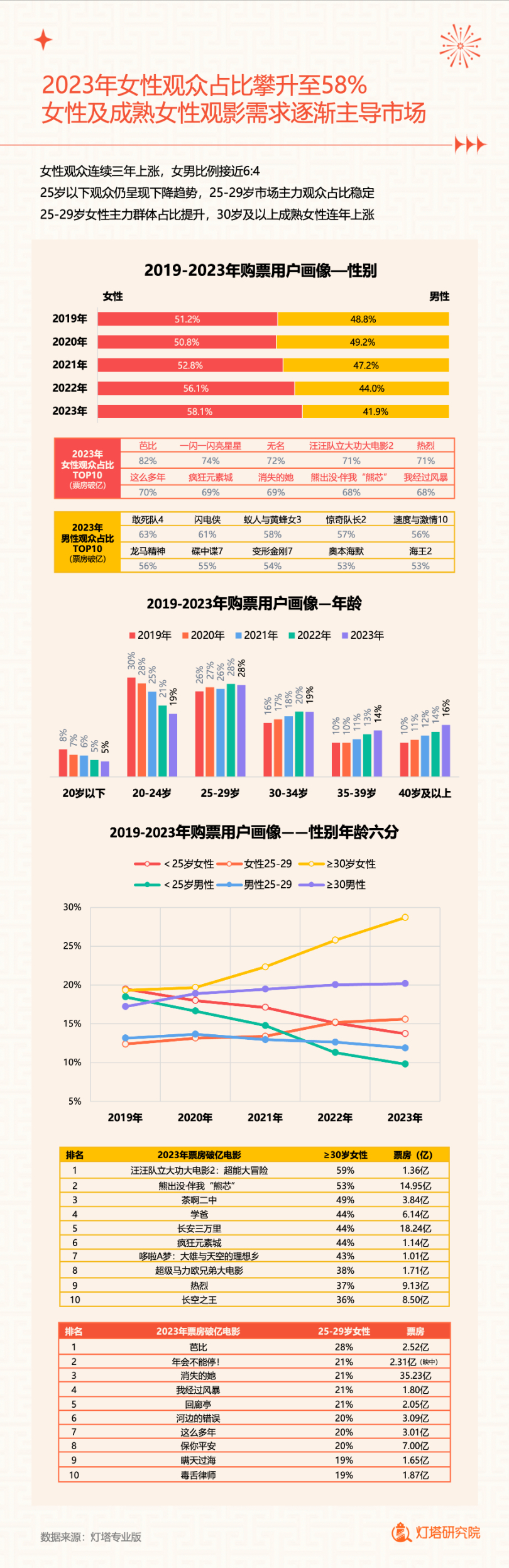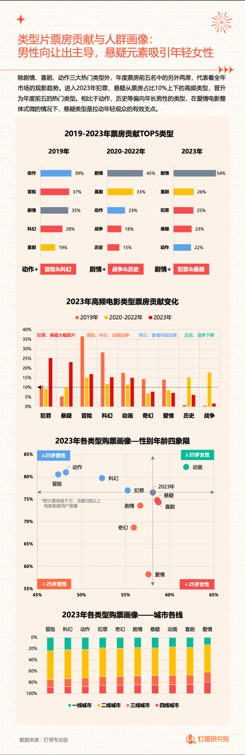 用户画像显示,2023年女性观众占比攀升至58%,女性及成熟女性观影需求逐渐主导市场。下沉市场观影人次继续保持40%以上,三四线城市年票房双双突破100亿。