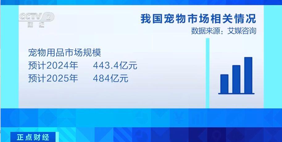 相关咨询机构发布的数据显示,2024年宠物用品市场规模预计为443.4亿元,到2025年将达到484亿元。