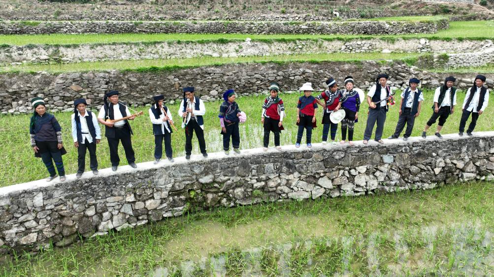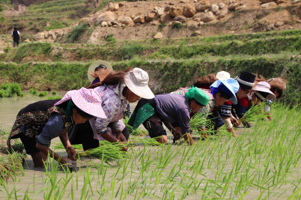 在元阳县沙拉托乡的哈尼梯田缓冲区,当地举行“开秧门”活动,村民们在田间地头祈福,他们载歌载舞,迎接春耕的到来。哈尼族多声部民歌州级传承人罗们妹说:“这是我们老一辈传承下来的民俗,一边栽秧一边唱歌,一边跳乐作舞,意味着稻谷会饱满、丰收。”