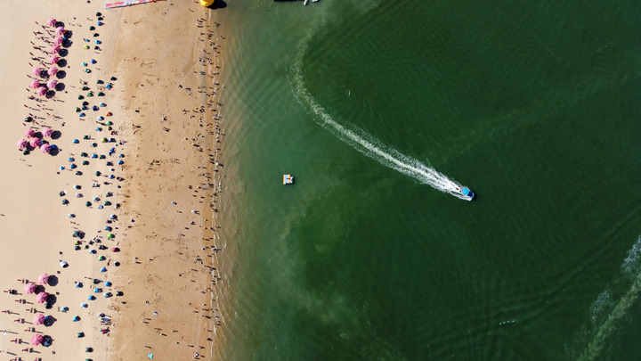 夏日时节,天津东疆湾沙滩的滩涂上,一群孩童欢乐地堆砌着沙石城堡,赶海拾贝的游客拎着小桶满载而归,到处萦绕着欢声笑语,冰饮、小吃等小摊店铺星罗棋布。