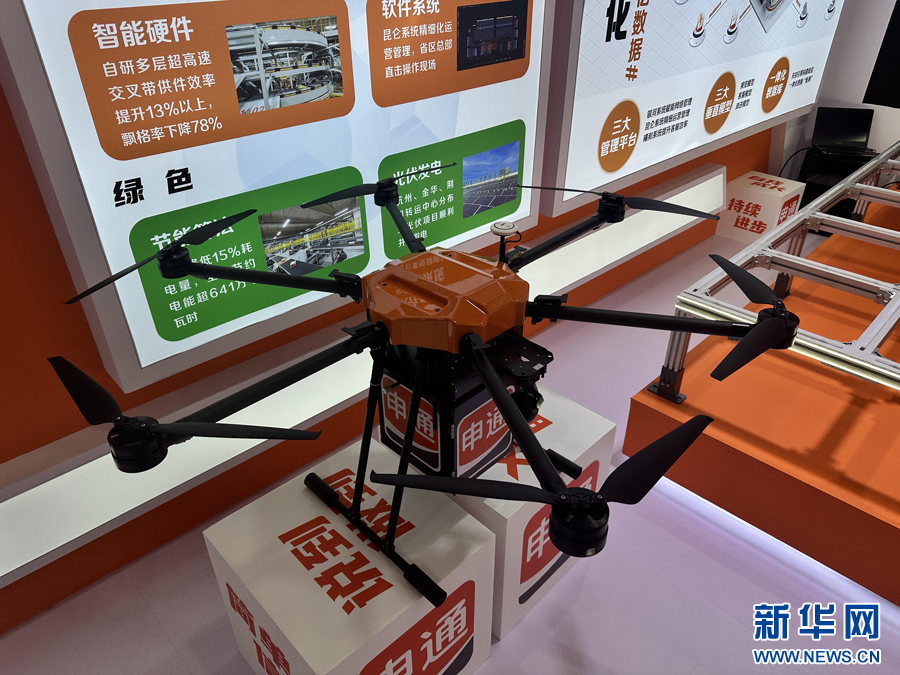 申通快递在展位重点展示了无人配送体系和自动分拣系统。无人配送体系包括多旋翼无人配送飞机和无人配送车。“这款多旋翼无人配送飞机可以把偏远区域的农产品运出来,实现‘出村进城’。”申通快递品牌副总监穆郁表示。