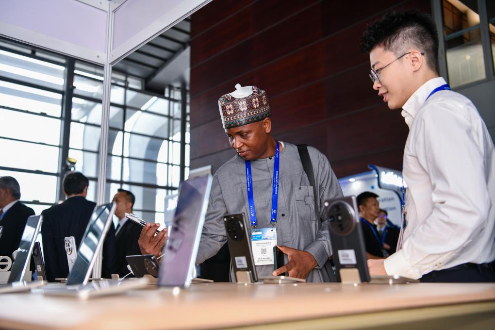 2024年5月8日,嘉宾在第六届全球AEO大会OPPO展台了解一款手机。新华社记者梁旭 摄