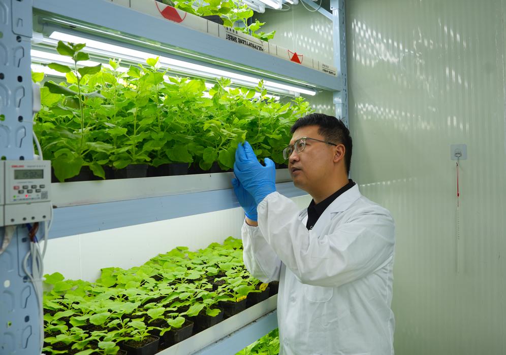 神笔生物创始人李仁汉在实验室观察发光植物生长情况(10月10日摄)。新华社发
