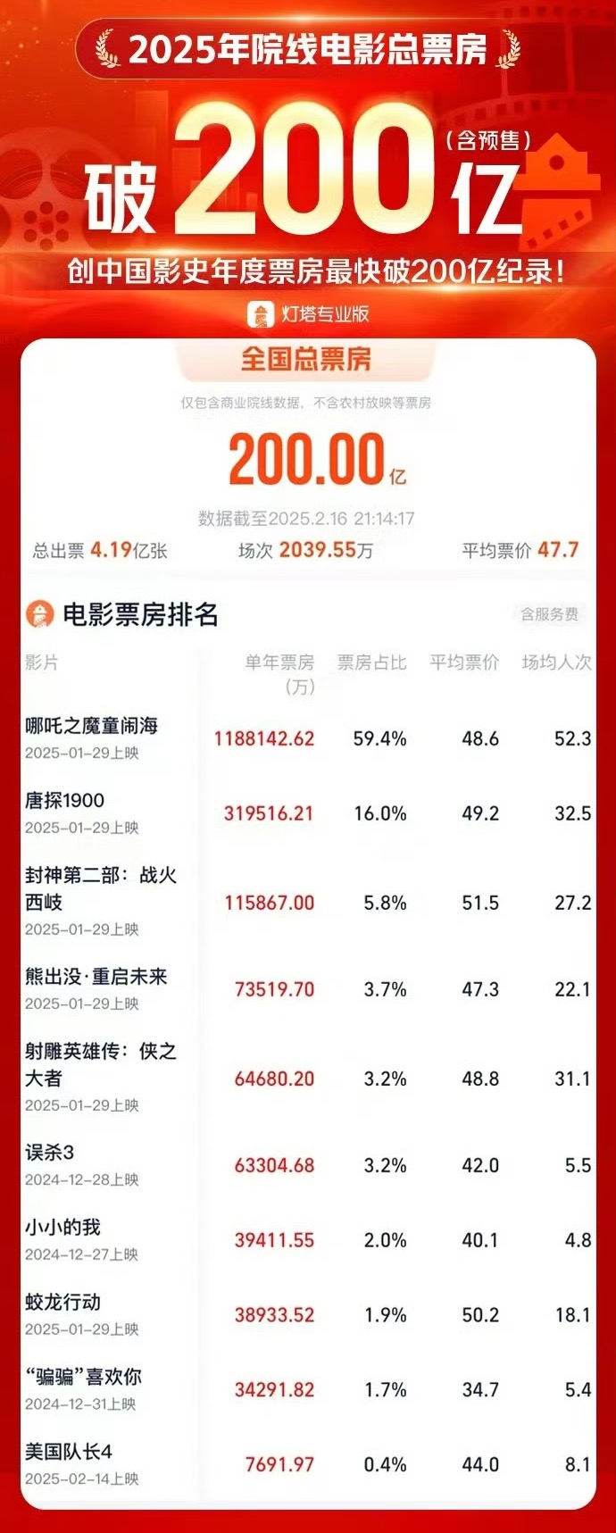 据网络平台数据,截至2月16日21时14分,2025年度大盘票房(含预售)突破200亿,刷新中国影史年度票房最快破200亿纪录,《哪吒之魔童闹海》领跑。