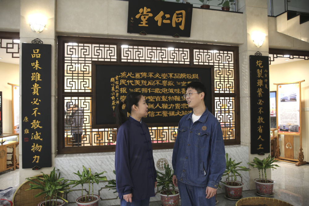 2月25日,北京同仁堂科技发展股份有限公司亦庄分厂技师李宁(左)在给徒弟讲述同仁堂制药历史。新华社记者 朱唯希 摄