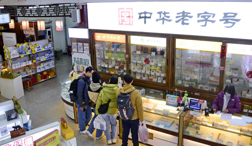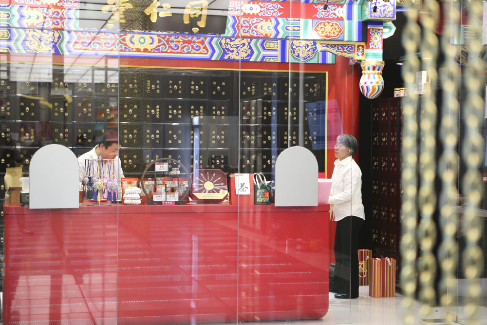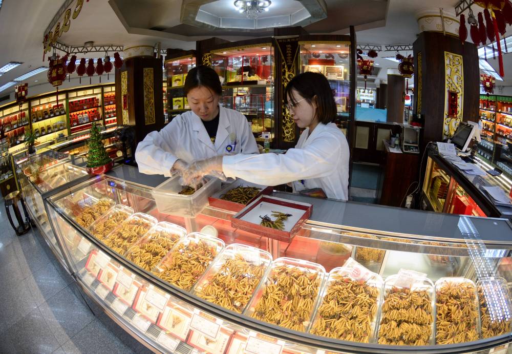2月25日,工作人员在北京前门大栅栏商业区的同仁堂药店内的中药保健品柜台忙碌。新华社记者 李欣 摄