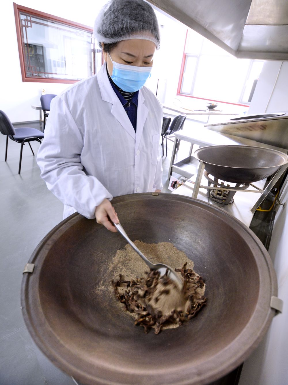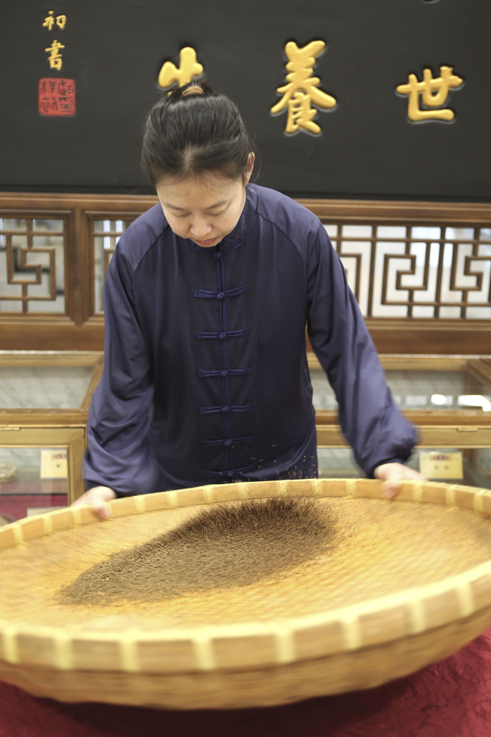 2月23日,同仁堂国家级非物质文化遗产生产性保护示范基地项目成员、中药炮制技艺首席技师吕建媛在展示传统中药材炒制技艺。新华社记者 李欣 摄