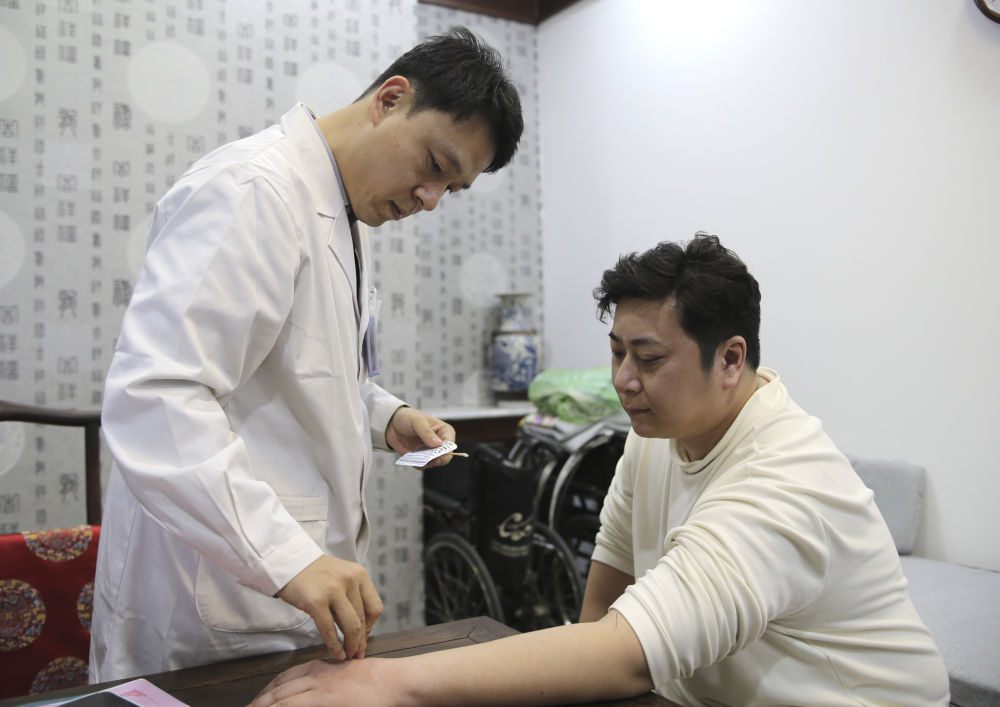 2月25日,中医专家郝鹏(左)在位于北京前门大栅栏商业区的同仁堂医馆为患者针灸。新华社记者 朱唯希 摄