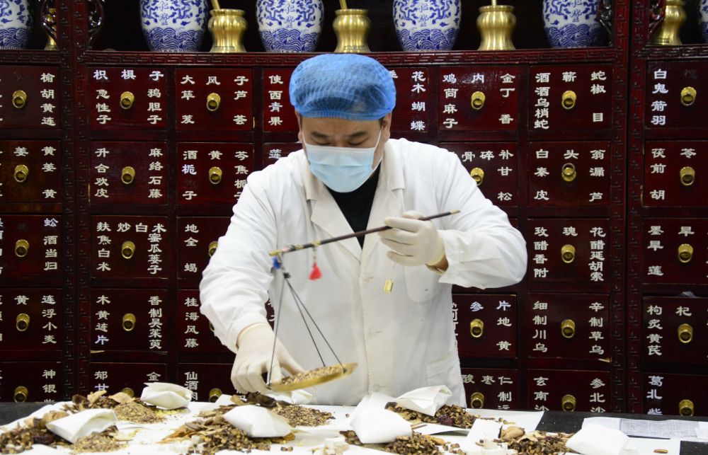 2月25日,医师在北京前门大栅栏商业区的同仁堂医馆内的中药药房为患者配药。新华社记者 李欣 摄