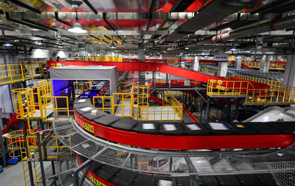 在顺丰速运天津全自动中转枢纽,快递包裹在全自动分拣线上传送。新华社记者孙凡越 摄