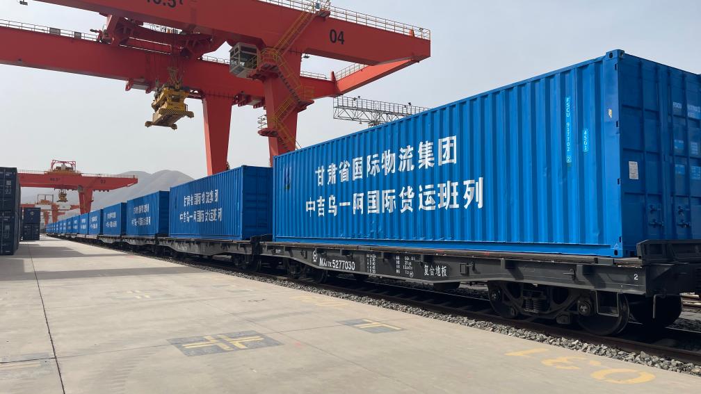 4月11日,满载纺织品、机械配件等货物的“中吉乌—阿”铁公联运国际班列从甘肃(兰州)国际陆港缓缓驶离,开往阿富汗海拉顿。