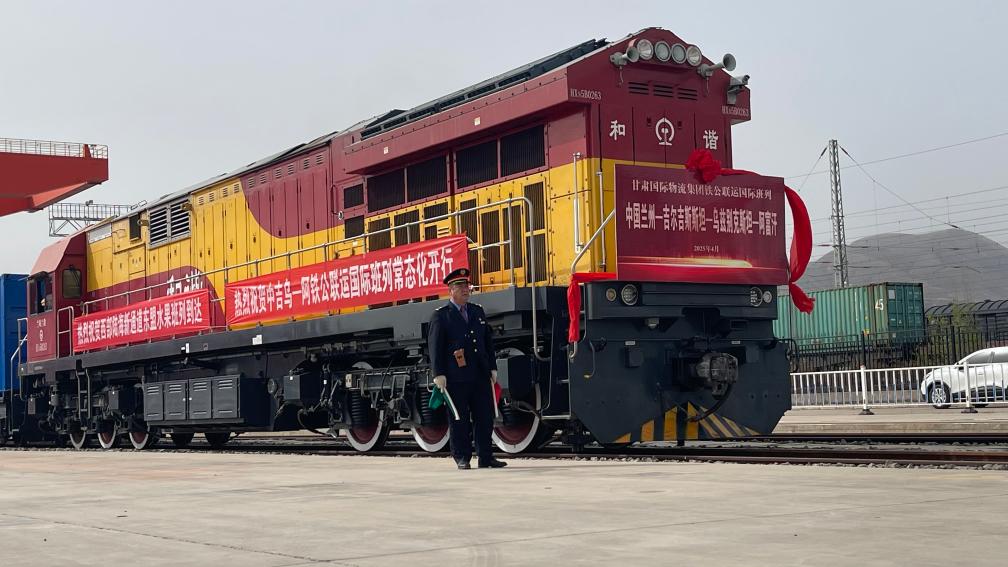 4月11日,“中吉乌—阿”铁公联运国际班列从甘肃(兰州)国际陆港驶离。新华社记者李杰 摄