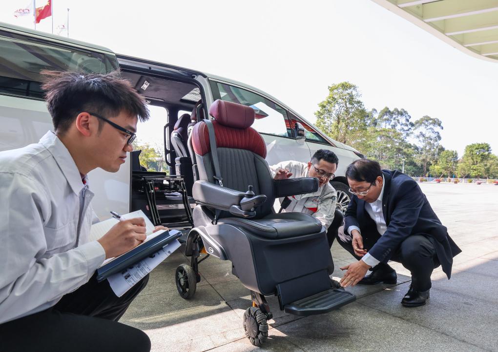 2月24日,全国人大代表、广汽集团董事长冯兴亚(右)在广州和广汽传祺一款无障碍汽车的车型经理分析可分离式电动福祉座椅的细节优化方案。新华社记者 刘大伟 摄