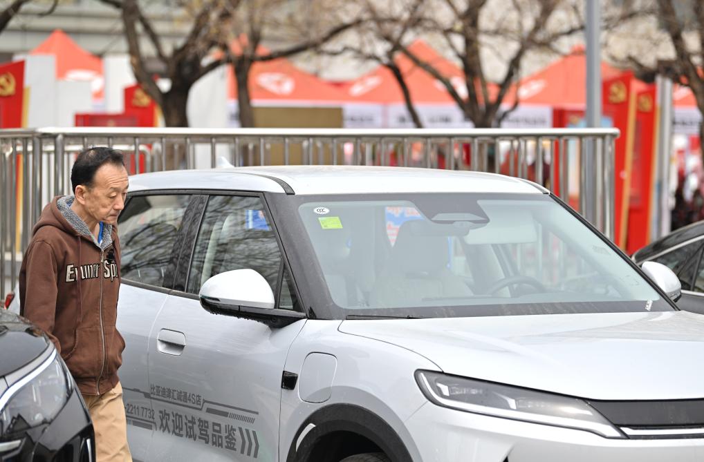 3月28日,天津市北辰区居民在活动现场看车。当日,天津市北辰区举行2025年消费品以旧换新惠民服务活动,现场汇聚了汽车、家电、数码产品等服务展区,吸引众多市民前来选购。新华社记者 李然 摄