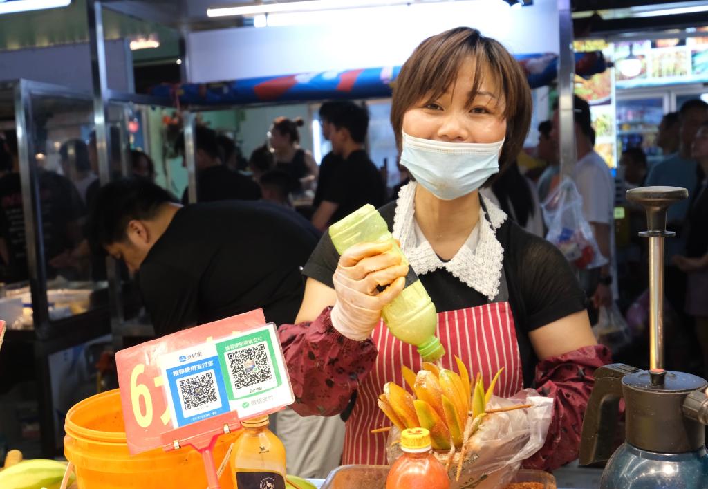 “我在埌西夜市集中摆摊一年多,省去了游击摆摊的困扰。这里人气旺,我每周末都能卖出200多个辣椒芒果花。”广西南宁埌西夜市摊主刘女士说。