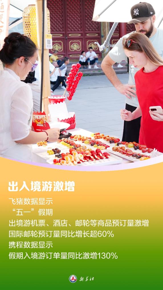 出境游、入境游市场持续升温。飞猪数据显示,“五一”假期,出境游机票、酒店、邮轮等商品预订量激增,其中国际邮轮预订量同比增长超60%。携程数据显示,今年“五一”假期期间,入境游订单量同比激增130%。