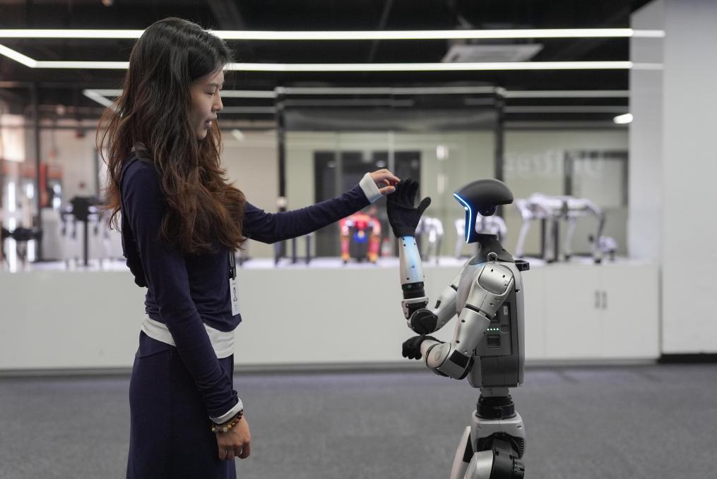 4月23日,在知名机器人公司杭州宇树科技展厅内,宇树人形机器人G1展示模仿动漫角色奥特曼的“光波”动作。 新华社记者 黄宗治 摄