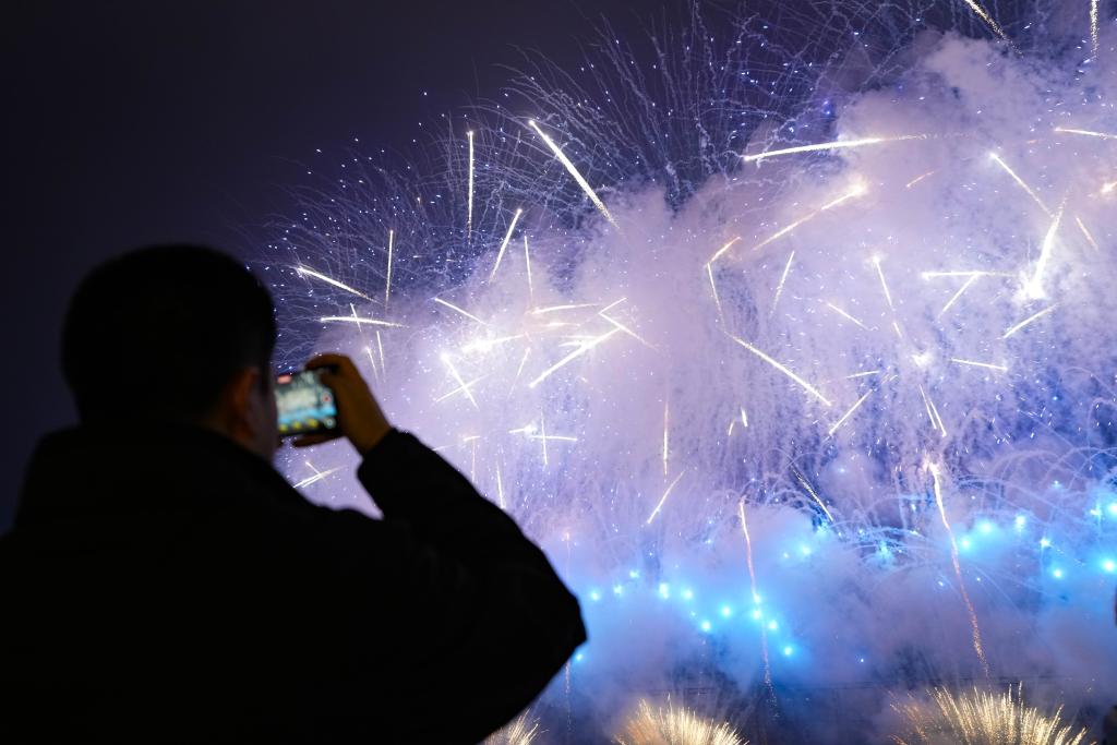 市民和游客在湖南省浏阳市天空剧院附近观看烟花表演(2024年12月28日摄)。新华社发(浏阳市委宣传部供图)