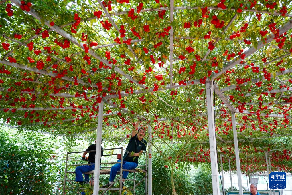 工作人员在位于山东省寿光市的寿光蔬菜高科技示范园养护“西红柿树”(5月23日摄)。 新华社记者 徐速绘 摄