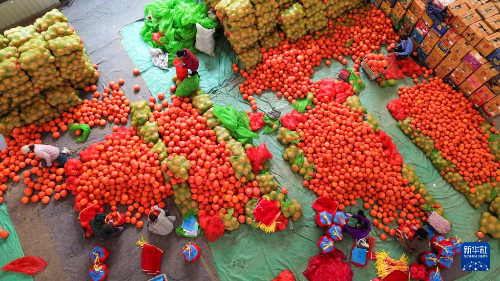 工作人员在山东寿光农产品物流园整理销往全国各地的蔬菜(1月21日摄,无人机照片)。 新华社记者 徐速绘 摄