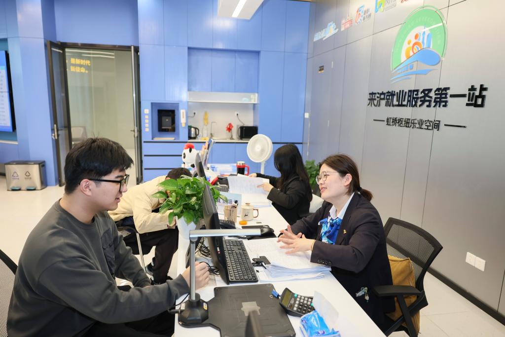 4月8日,上海虹桥枢纽乐业空间举行4月首场招聘会,求职者(左一)在现场咨询职业技能补贴政策。新华社记者 王翔 摄