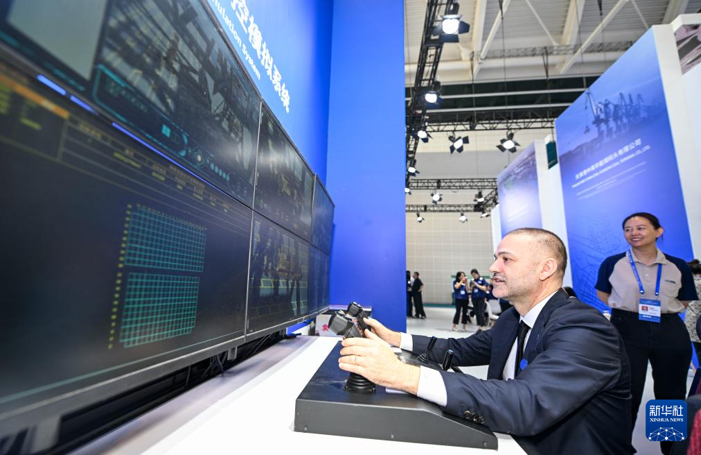 6月12日,与会者在博览会天津港展台体验码头远程操控模拟系统。新华社记者 赵子硕 摄