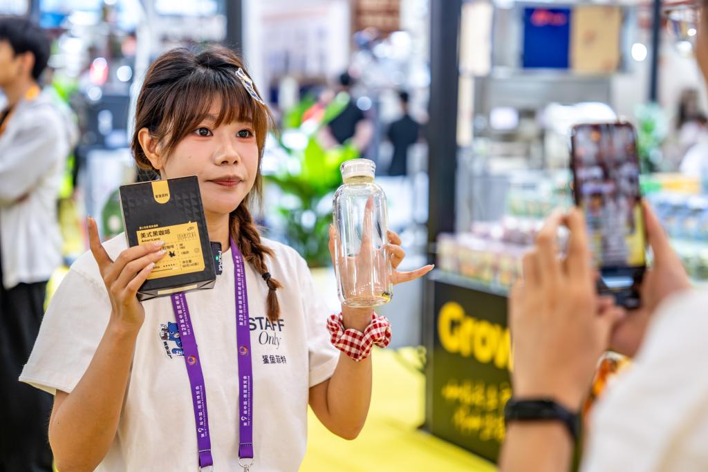6月19日,一名参展商在第9届中国—南亚博览会咖啡产业馆直播推介云南小粒咖啡。新华社记者胡超 摄