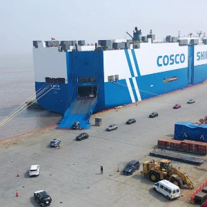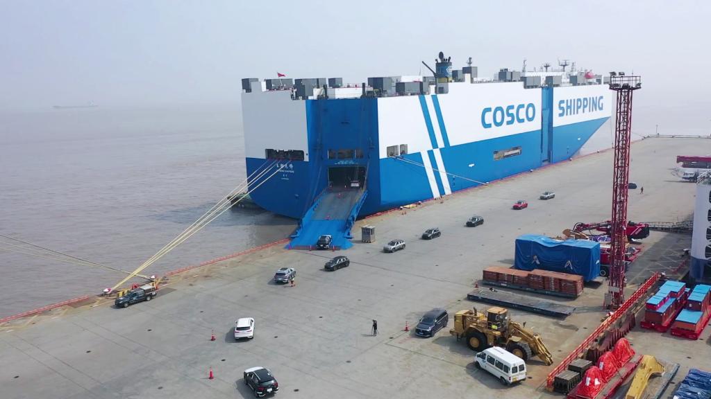 图为一批中国制造的汽车在上海浦东外高桥港装船运往秘鲁钱凯港。(上海海关供图)