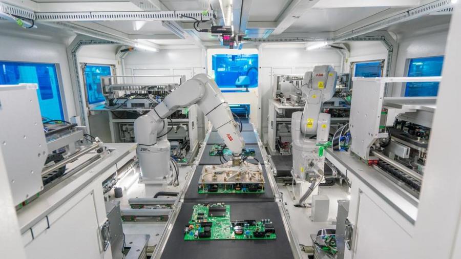 现代化的生产车间里,大部分工作已被机械臂和机器人“接管”;车间一侧的智慧大屏上,实时显示温湿度、静电、隐患巡查等关键数据。