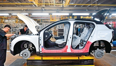 工作人员在河北张家口南山汽车产业基地一家车企的总装车间组装汽车。新华社记者 王 晓摄