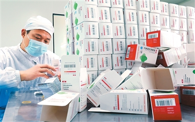 近年来,江苏省连云港市加快发展以医药行业为主的新质生产力,医药创新步伐不断加快,建立起强大的超过万人的研发团队,加速由技术输入变为技术输出,融入全球医药创新链。图为连云港高新技术产业开发区一家药业公司,工人正在将一批药品装盒打包。耿玉和摄(人民视觉)