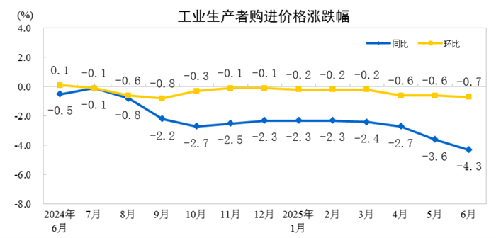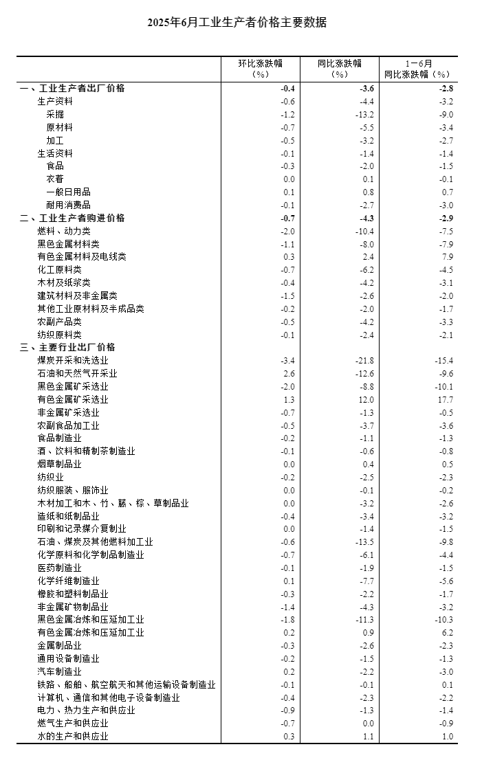 2025年6月份,全国工业生产者出厂价格同比下降3.6%,环比下降0.4%;工业生产者购进价格同比下降4.3%,环比下降0.7%。上半年,工业生产者出厂价格比上年同期下降2.8%,工业生产者购进价格下降2.9%。