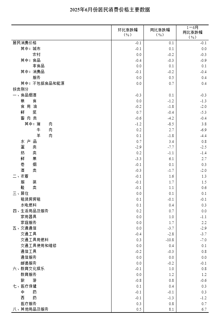 2025年6月份,全国居民消费价格同比上涨0.1%。其中,城市上涨0.1%,农村下降0.2%;食品价格下降0.3%,非食品价格上涨0.1%;消费品价格下降0.2%,服务价格上涨0.5%。上半年,全国居民消费价格比上年同期下降0.1%。
