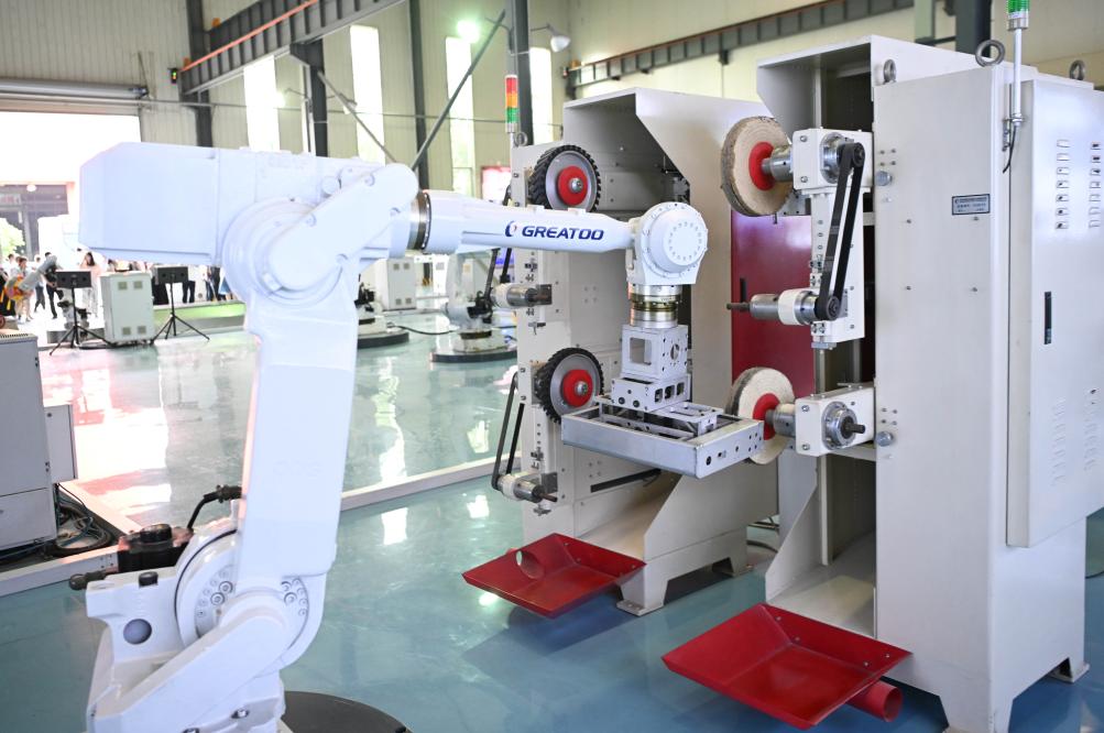 位于揭阳的巨轮智能装备股份有限公司的光伏控制箱机器人打磨单元(6月29日摄)。新华社记者邓华摄