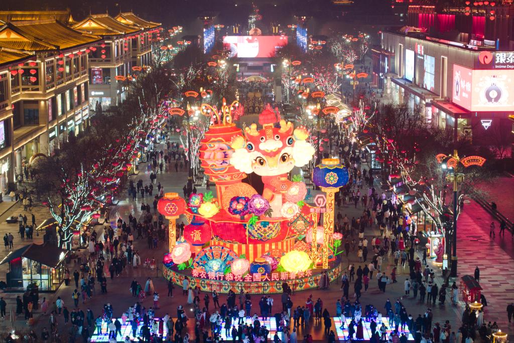 市民游客在西安大唐不夜城游玩(1月22日摄,无人机照片)。新华社记者邵瑞摄
