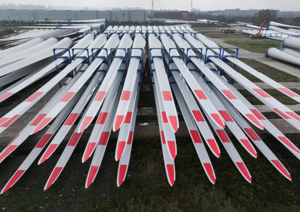 这是2024年11月2日在重通成飞风电设备江苏有限公司拍摄的风力发电机组叶片(无人机照片)。新华社记者宋彦桦摄