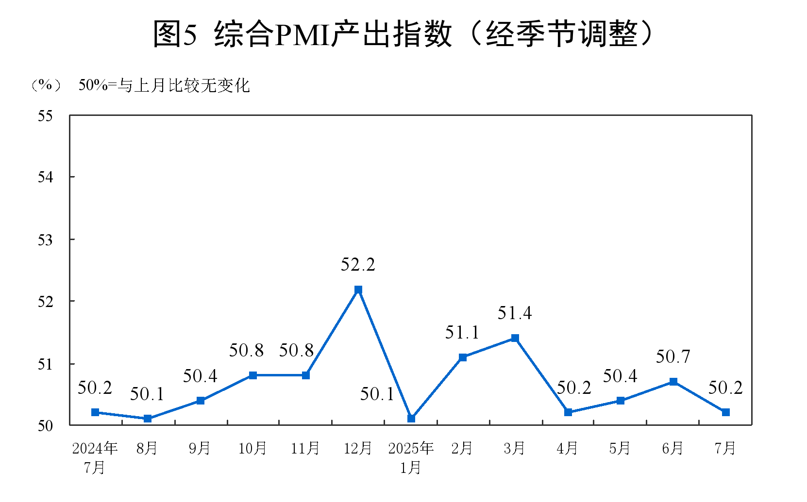 7月份,综合PMI产出指数为50.2%,比上月下降0.5个百分点,仍高于临界点,表明我国企业生产经营活动总体保持扩张。