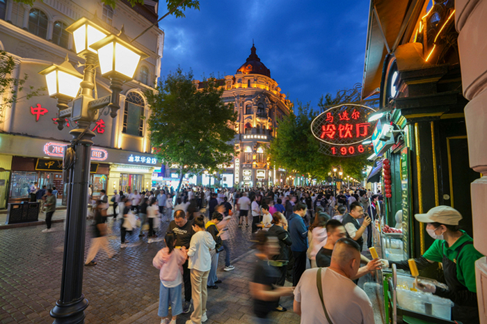 在哈尔滨,有着百年历史的中央大街人潮涌动,阳台音乐会传来悠扬琴声,网红店前排着长队,俄式风味餐厅里座无虚席;