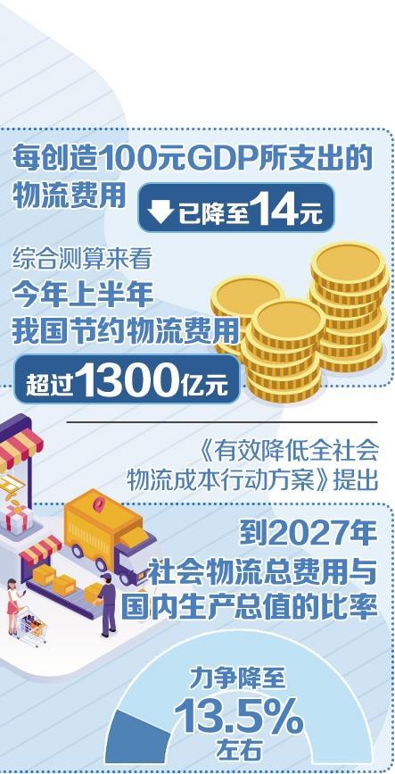 “这意味着,每创造100元GDP,所支出的物流费用已降至14元。综合测算来看,今年上半年,我国节约物流费用超过1300亿元。”国家发展改革委社会所研究员邢伟表示,虽然只下降了0.1个百分点,但反映出供应链协同效率增强,为实体经济减轻负担,带来真金白银实惠。