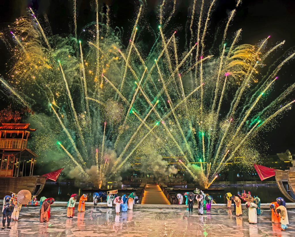 在长沙靖港古镇,景区沿江打造了“行浸式”演艺漫游《花开靖港》——游客乘坐古色古香的游船,于水面上缓缓而行。人们在欣赏演艺节目的同时,身临其境地感受湖湘民俗文化、商埠繁华长卷与水乡市井百态。身着古装的商贩在岸边吆喝叫卖,非遗传承人的表演与河水中的倒影相映成趣。