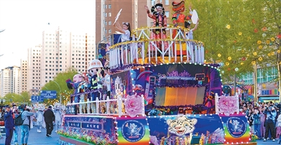 傍晚时分,青海西宁市城北区豹街开启花车巡游。记者 曹继炜 摄