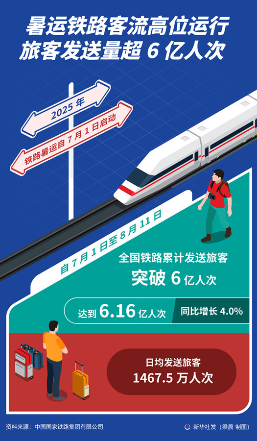 2025年铁路暑运自7月1日启动。记者8月12日从中国国家铁路集团有限公司获悉,自7月1日至8月11日,全国铁路累计发送旅客突破6亿人次,达到6.16亿人次,同比增长4.0%,日均发送旅客1467.5万人次。
